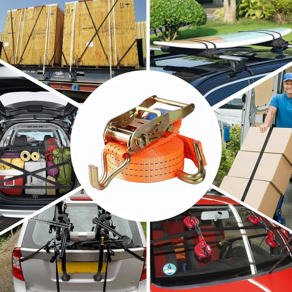 Ratchet Lashing Straps: Professional-grade tie-down belts with heavy-duty tensioning ratchets, available in widths from 25mm to 100mm.